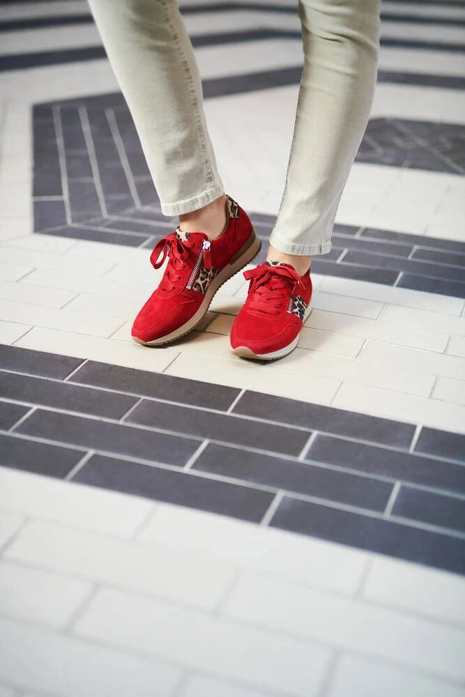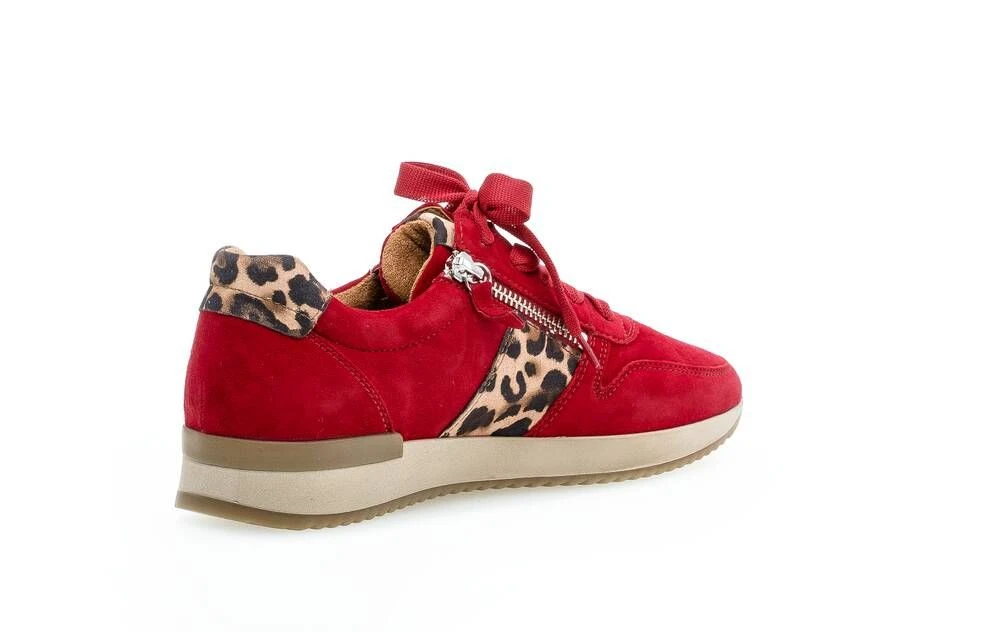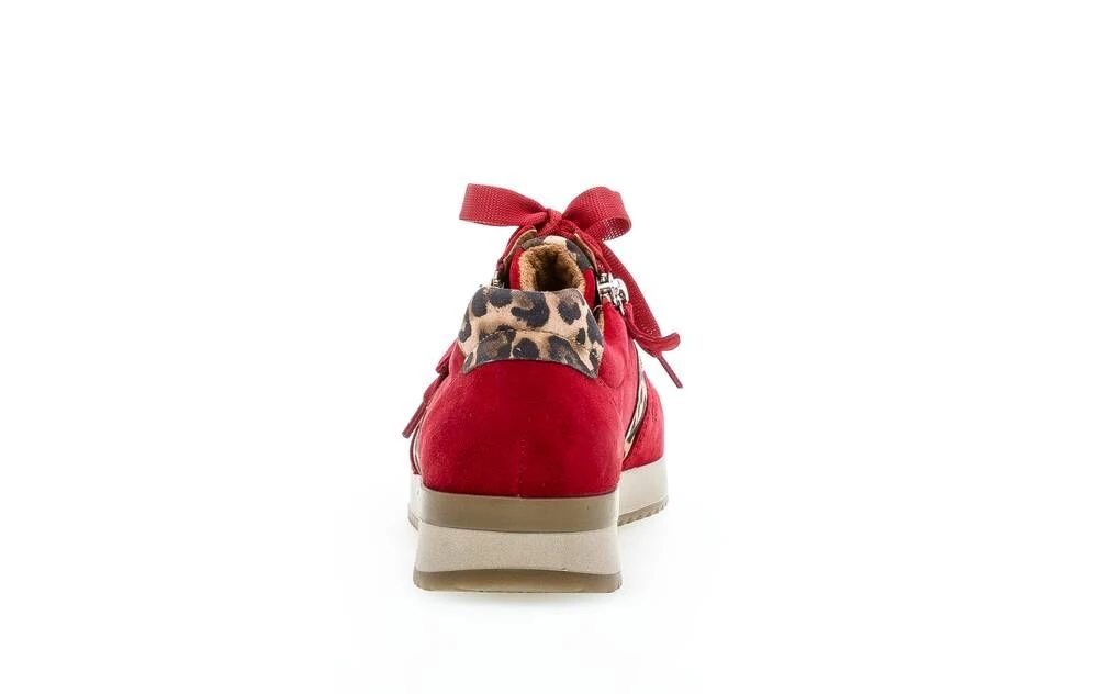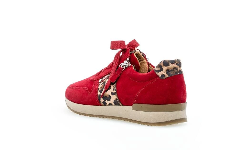 Matalalla kiilapohjalla varustetut pirteän punaiset sneakerit nauhakiinnityksellä. Leopardikuosiset osuudet viimeistelevät tyylikkään kokonaisuuden.