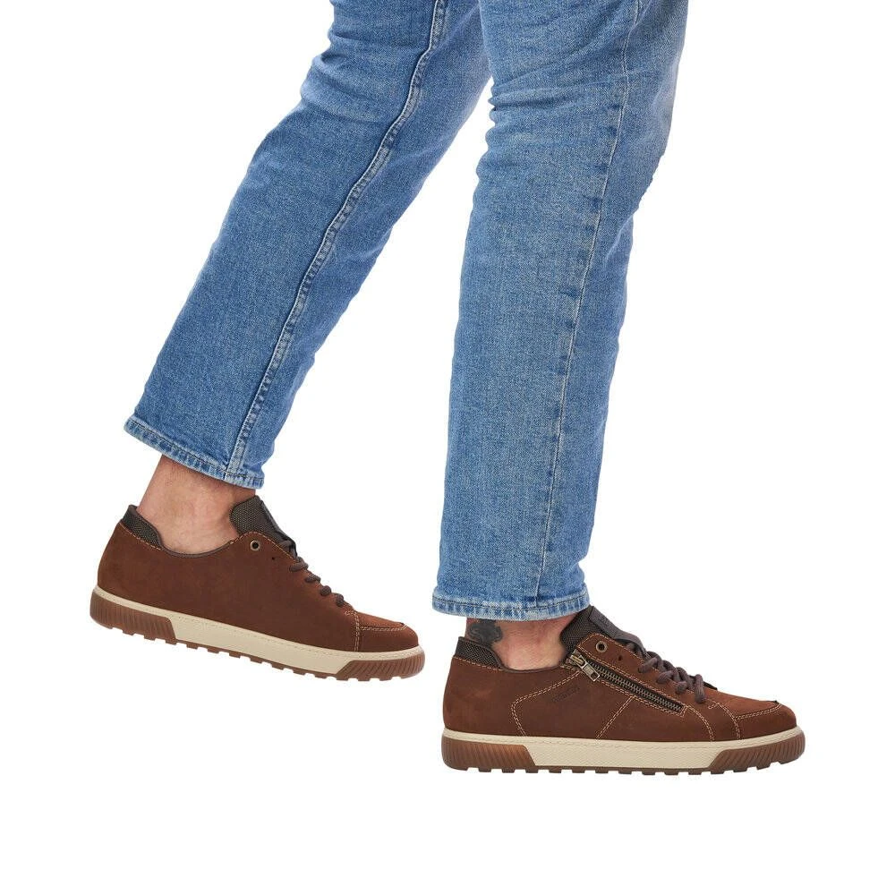 Miesten mokkanahkaiset kävelykengät nauhakiinnityksellä ja ulkoreunojen vetoketjuilla. Käyttömukavuutta lisää ehmeät pohjalliset sekä reilu lesti.