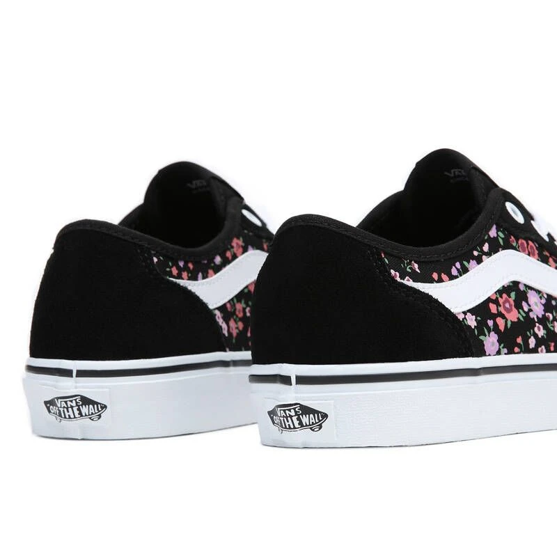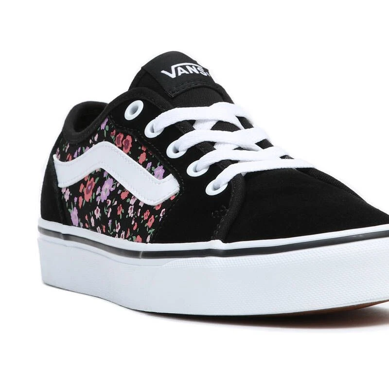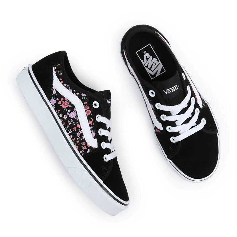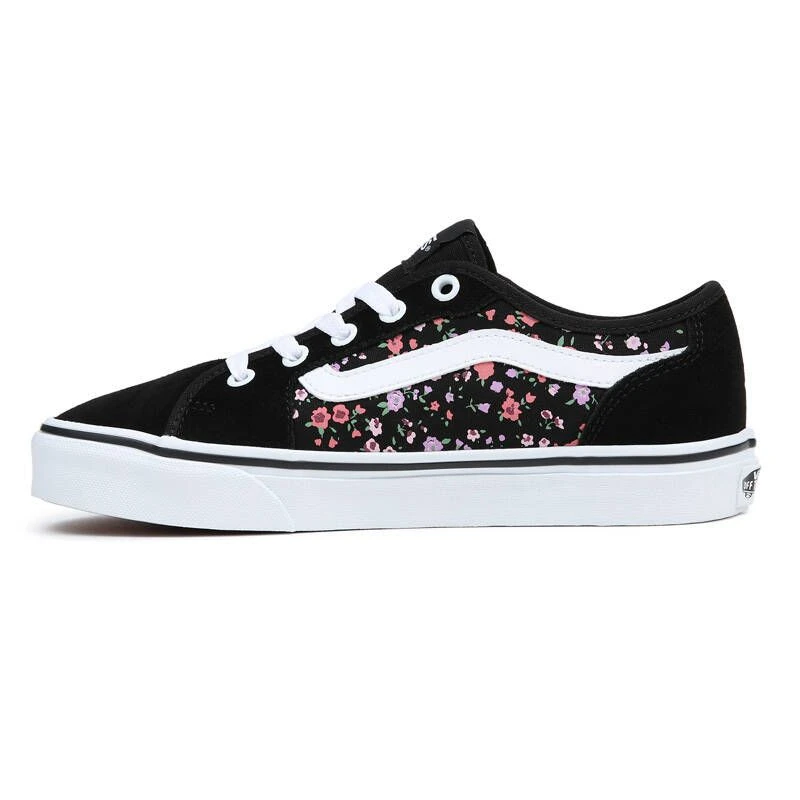 Naisten nauhakiinnitteiset tennarit sivujen värikkäillä kukkakuoseilla ja valkoisella tasapohjalla.